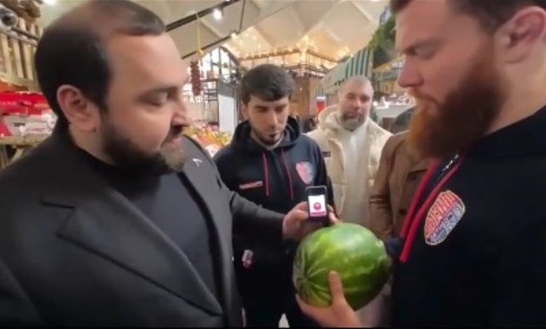 به گزارش خبرآنلاین، در یک ویدئوی وایرال شده، نماینده دومای روسیه در بازاری هندوانهای در دست گرفته و میگوید، هندوانه ایرانی نخرید، هندوانه داغستان بخرید! و در آن، دستگاهی دیده میشود که بر روی یک هندوانه قرار داده شده و به نظر میرسد برای اندازهگیری میزان نیترات یا کیفیت میوه استفاده میشود.